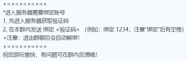 为了提高玩家质量,服务器需要绑定 QQ 才可进入,先入服获取验证码,后点击下方加入交流群,根据群内提示进行验证(并不麻烦哦)